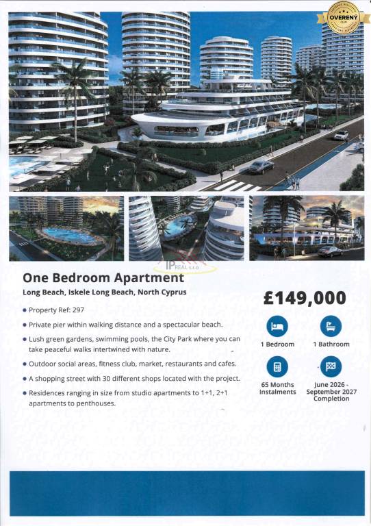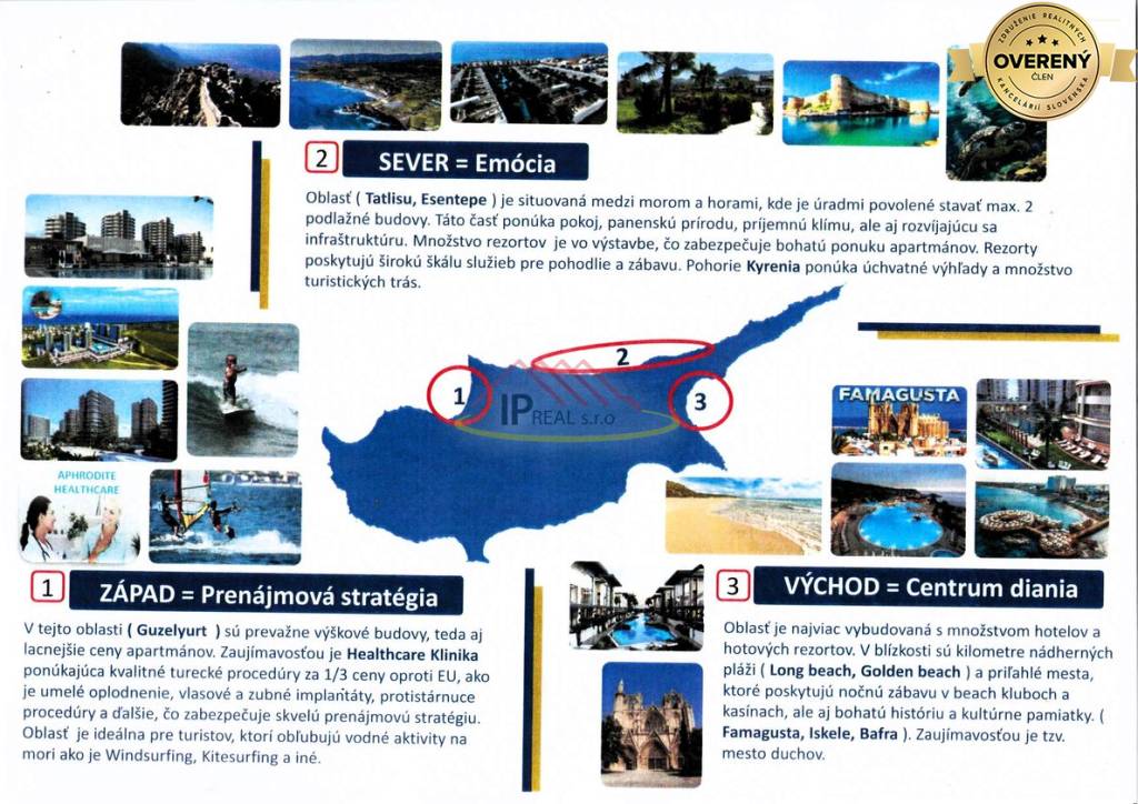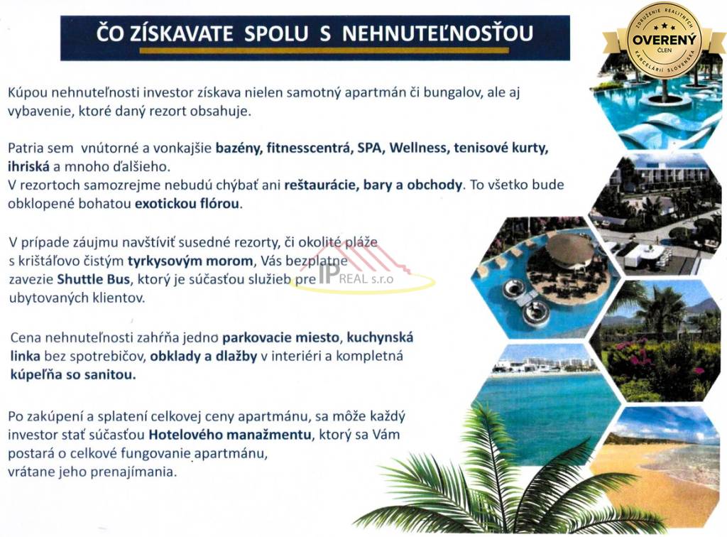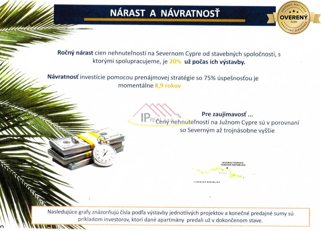 Severný Cyprus s až 320 slnečnými dňami v roku je ohodnotený ako jedna z najlepších celosvetovo populárnych destinácií. U nás si môžete vybrať apartmán s výmerami od 35 m2 do 250 m2, ktorého investíciu doň vloženú viete ďalej zhodnotiť prenájmom s garantovaným výnosom a zabezpečenými službami spojenými s prenájmom vášho apartmánu, čím bude majiteľ odbremenený od týchto povinností. V tejto rýchlo rozvíjajúcej sa dovolenkovej destinácii vzhľadom na narastajúce ceny nehnuteľností je možné zhodnotiť vložené finančné prostriedky predajom danej nehnuteľnosti už počas jej výstavby . Financovanie je možné aj v splátkach – pri podpise kúpnej zmluvy stačí zaplatiť 35% z ceny apartmánu, ceny ponúkaných apartmánov sa začínajú od 114 000.- eur ,zvyšok kúpnej ceny je možné uhrádzať mesačnými alebo kvartálnymi splátkami.
